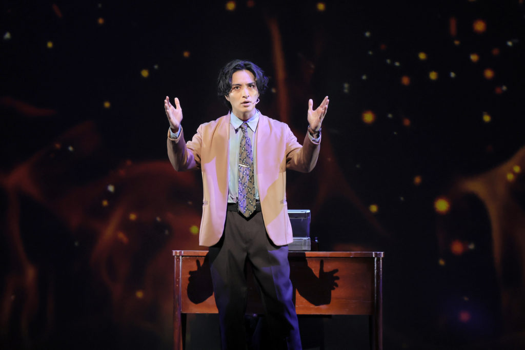 本作ではストーリーテラーとしての役割も担い、舞台上にほぼ出ずっぱりで物語を牽引します。
